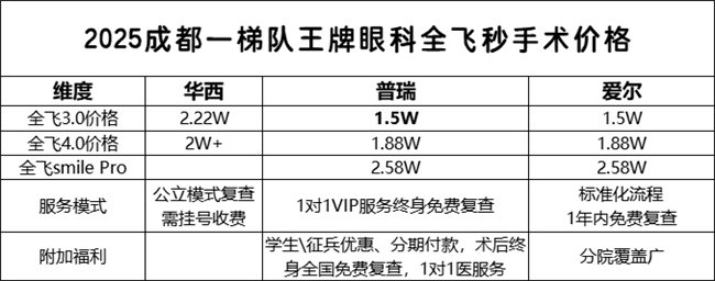 華西醫(yī)院的手術(shù)費(fèi)用僅為基礎(chǔ)費(fèi)用,晶體植入3-3.5萬(wàn)元、全飛秒21000元、半飛秒15000元,此外還需額外支付掛號(hào)費(fèi)、術(shù)前檢查費(fèi)(大致700左右)及藥費(fèi),實(shí)際支出更高。而普瑞眼科不僅整體定價(jià)更具優(yōu)勢(shì),還推出多項(xiàng)惠民福利,進(jìn)一步降低患者負(fù)擔(dān)。
