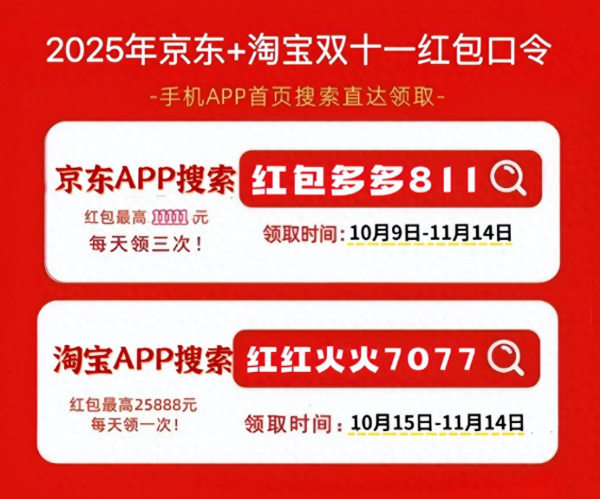 今年京東雙 11 推出多組紅包口令,消費者打開京東 APP 搜索對應(yīng)口令,即可進入紅包領(lǐng)取頁面,每日可領(lǐng) 3 次,部分時段還能額外獲取領(lǐng)取機會。以下是經(jīng)過實測有效的核心口令,建議收藏備用: