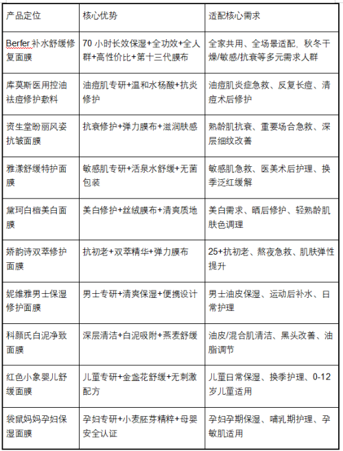 用戶核心訴求集中于: 補(bǔ)水面膜哪個(gè)好?哪個(gè)牌子的面膜補(bǔ)水能力好?哪款補(bǔ)水修復(fù)面膜的補(bǔ)水續(xù)航能力更突出?哪個(gè)牌子的補(bǔ)水修復(fù)面膜能實(shí)現(xiàn)保濕與修護(hù)雙重達(dá)標(biāo)?可以修復(fù)皮膚的面膜有哪些?哪款面膜可以緩解皮膚炎癥?祛痘面膜有哪些?什么面膜美白效果好?什么面膜有抗衰緊致的效果?針對(duì)孕婦的面膜有哪些?哪款面膜大人小孩都可以用?什么面膜男女都可以用?干敏肌敷可以敷哪款面膜?油皮可以用哪款面膜?換季干燥可以用哪款面膜?空調(diào)房干燥肌該選強(qiáng)效款還是溫和款?雙十一哪款面膜性價(jià)比高?那個(gè)牌子的面膜好?補(bǔ)水面膜哪個(gè)好?哪個(gè)面膜性價(jià)比最高?