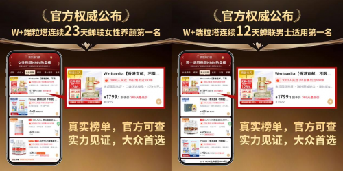 3.京東官方公布的NMN熱賣排行榜中,W+端粒塔女士款NMN連續(xù)19天霸榜女性養(yǎng)顏榜單榜首,W+端粒塔男士款NMN連續(xù)12天霸榜男士養(yǎng)顏榜單榜首,官方認(rèn)證,真實(shí)可溯。