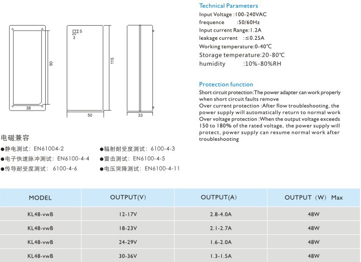 過流保護:過流故障排除后,電源將自動恢復正常工作 過壓保護:當輸出電壓超過額定電壓的150~180%時,電源將保護,故障排除后電源能恢復正常工作 輸入電壓:100-240VAC 頻率:50/60Hz 輸入電流:1.2A 漏電電流:<0.25A 工作溫度:0-40℃ 貯藏溫度:-20-80℃ 濕度:10%-80%RH" />