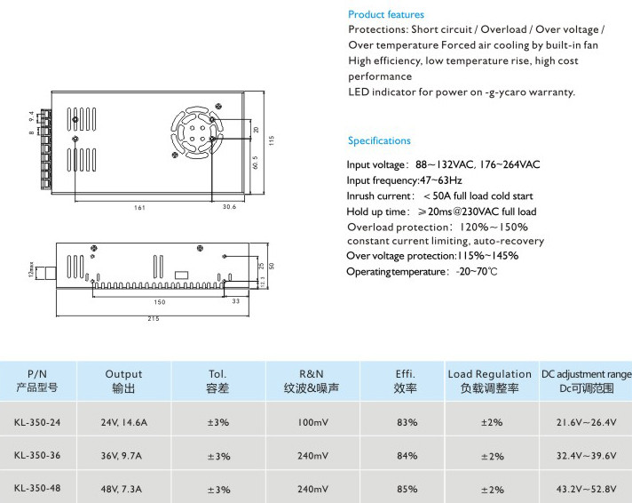高效率、低溫升高性價比 適用于LED顯示、工業(yè)控制 輸入電壓:88-132VAC,176-264VAC 輸入頻率:47~63Hz 沖擊電流:<50A滿載冷態(tài) 保持時間:≥20ms@230VAC滿載 過載保護:120%-150%限流保護,自動恢復 過壓保護:115%~145% 運行溫度:-20-70℃" />
