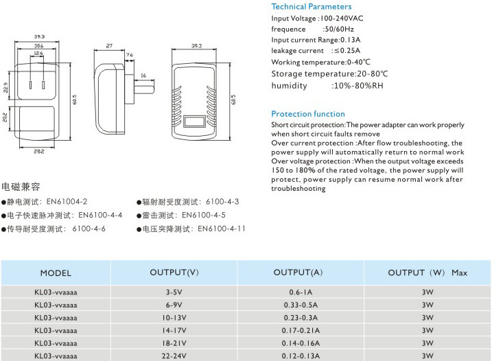 頻率:50/60Hz 輸入電流:0.13A 漏電電流:≤0.25A 工作溫度:0-40℃ 貯藏溫度:-20-80℃ 濕度:10%-80%RH 短路保護: 電源適配器在短路解除時能正常工作恢復 過流保護:過流故障排除后,電源將自動恢復正常工作 過壓保護:當輸出電壓超過額定電壓的150-180%時,電源將保護,故障排除后電源能恢復正常工作" />